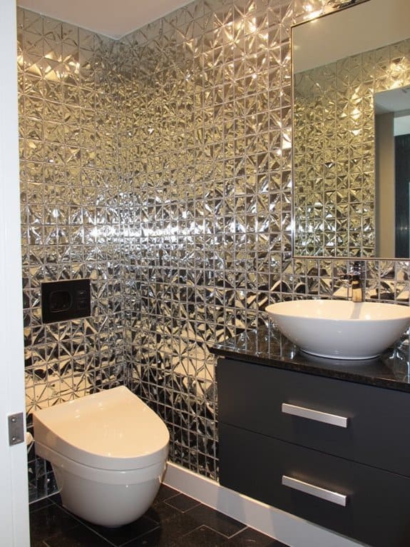 The design possibilities range from honeycomb patterns with hexagonal mirrors to diamond shapes in alternating sizes, angled rectangles, and cascading circles. By incorporating different metallic finishes between the mirror pieces, these arrangements add sophisticated dimensionality and transform ordinary bathroom walls into dramatic architectural features.