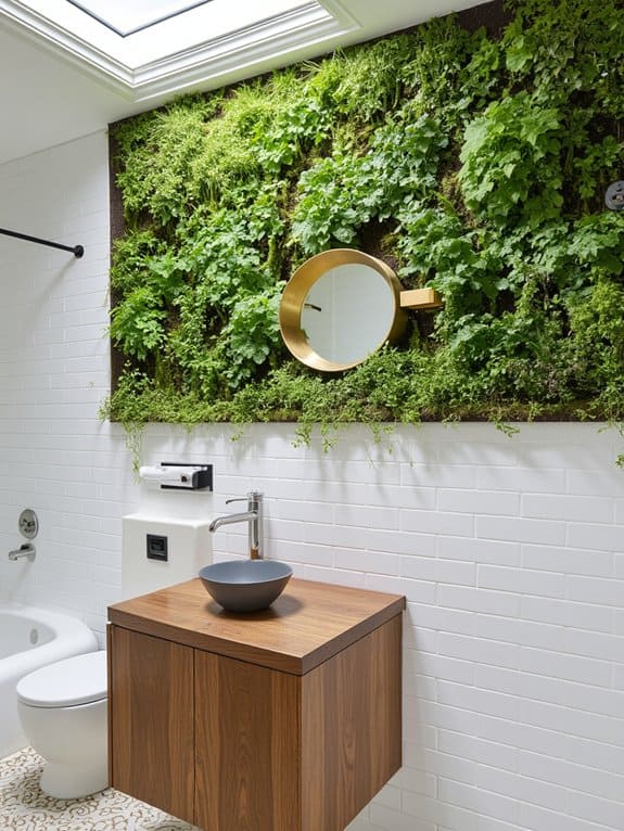 A vertical garden wall transforms a half bathroom into a natural oasis by bringing living plants indoors while making efficient use of limited wall space. This feature improves air quality, regulates humidity naturally, and creates a striking visual centerpiece in the room.