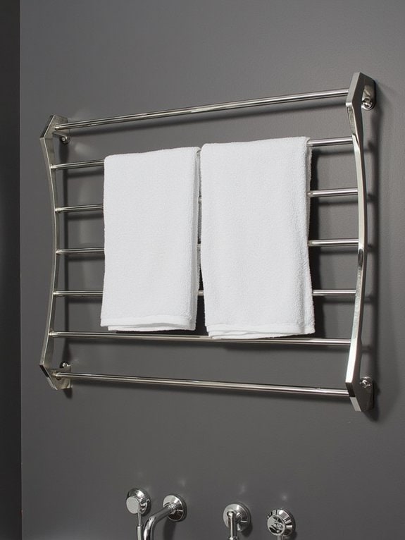 Today’s modern metallic towel racks blend form and function, featuring contemporary finishes like brushed nickel and chrome that enhance bathroom aesthetics while providing essential storage. These sleek installations bring sophistication to half bathrooms while maximizing space efficiency.