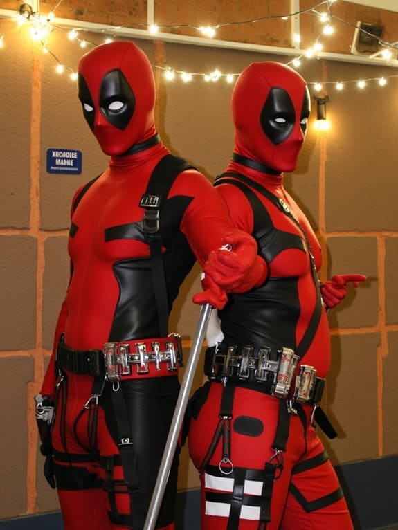 Matching red suits with black accents are the quintessential element for couples wanting to embody Deadpool’s iconic look. The coordinated superhero costumes feature spandex material, eye and chest detailing, and essential accessories like foam katanas and utility belts.
