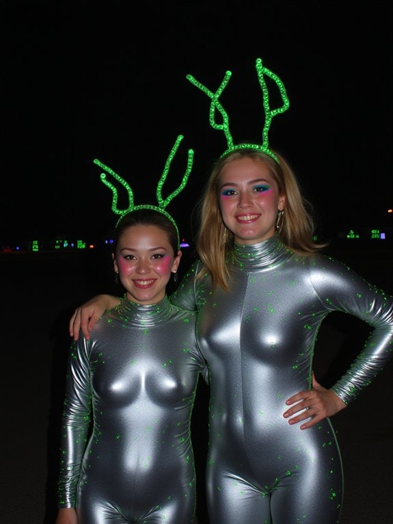 Glowing alien antenna headbands are illuminated costume accessories that create an otherworldly effect for extraterrestrial or UFO-themed outfits. These headpieces combine LED string lights with metallic-wrapped headbands and silver foam balls to produce a cosmic appearance.