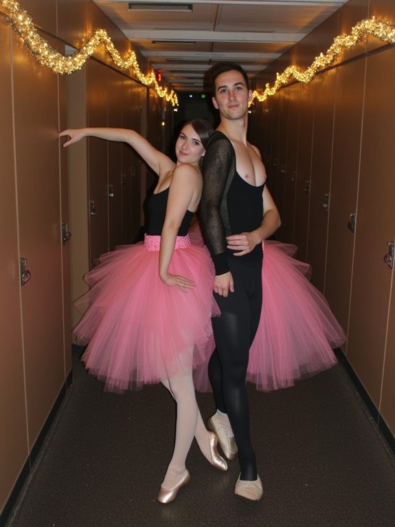 For a convincing dance costume, combine a pink practice skirt with black leotard, flesh-toned tights, and ballet slippers. Complete the look with leg warmers and a sleek ballet bun secured with bobby pins and hairspray. This versatile ensemble works well for both authentic dance practice and costume events, especially when coordinated with a dance partner.
