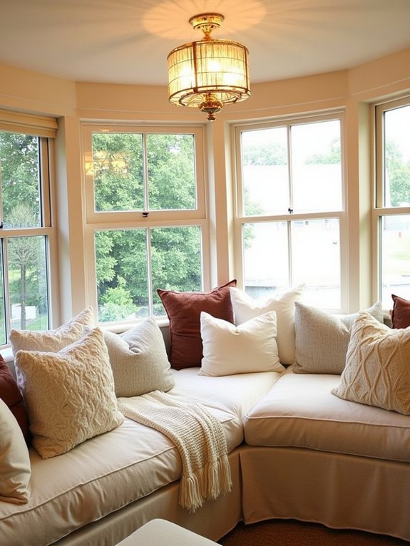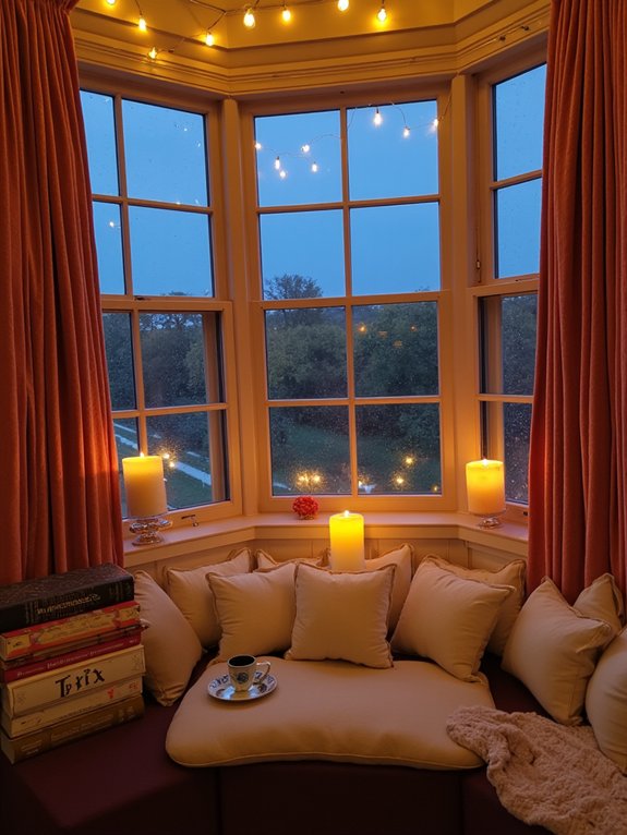 A window bench serves as a personal retreat for peaceful moments, enhanced by soft cushions and pillows that transform it into an inviting reading nook. The strategic placement of flameless candles adds gentle illumination while maintaining safety, creating the perfect atmosphere for relaxation or contemplation while gazing through the window.
