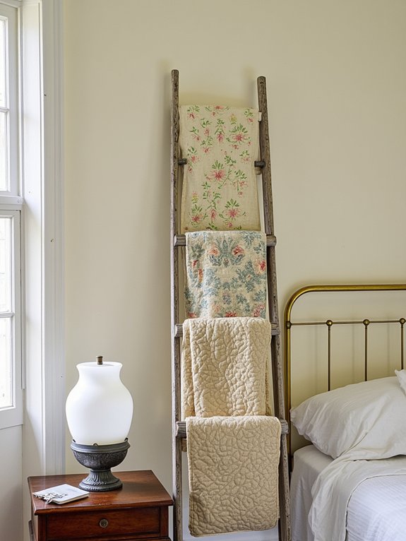 Vintage quilt display ladders transform functional wooden ladders into elegant decor pieces that showcase treasured quilts while maximizing vertical wall space. These ladders create a rustic yet sophisticated focal point in bedrooms or living areas.
