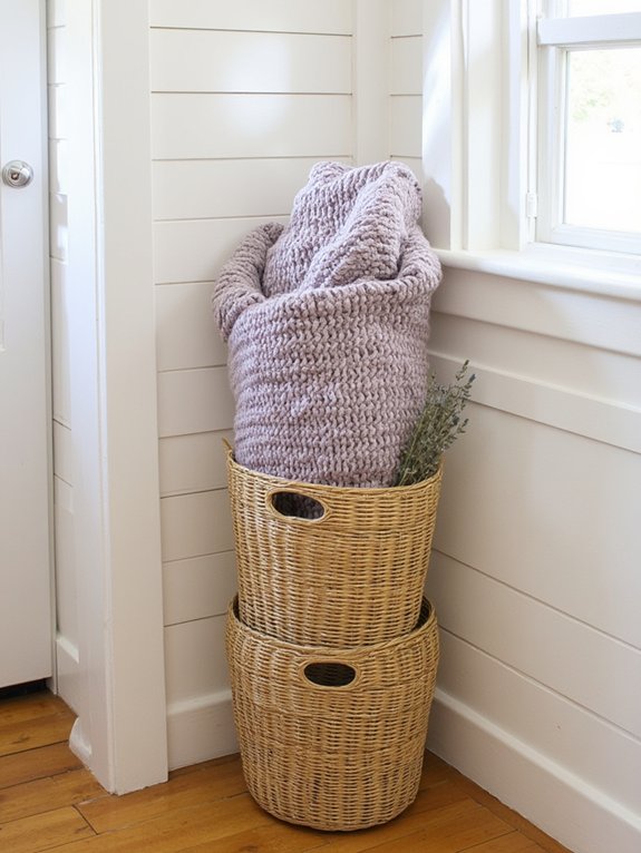 In this bedroom corner arrangement, stacked woven baskets create both visual appeal and practical storage. Three graduated baskets positioned diagonally transform an empty corner into a stylish focal point while providing organized space for blankets, pillows, and decorative items.