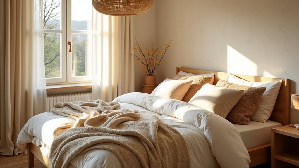 A chunky linen window seat transforms an ordinary bedroom corner into an inviting retreat. The deep cushioning and natural textures create a cozy nook perfect for reading or contemplation beneath the filtered sunlight, while built-in storage drawers provide space for blankets and seasonal pillows.