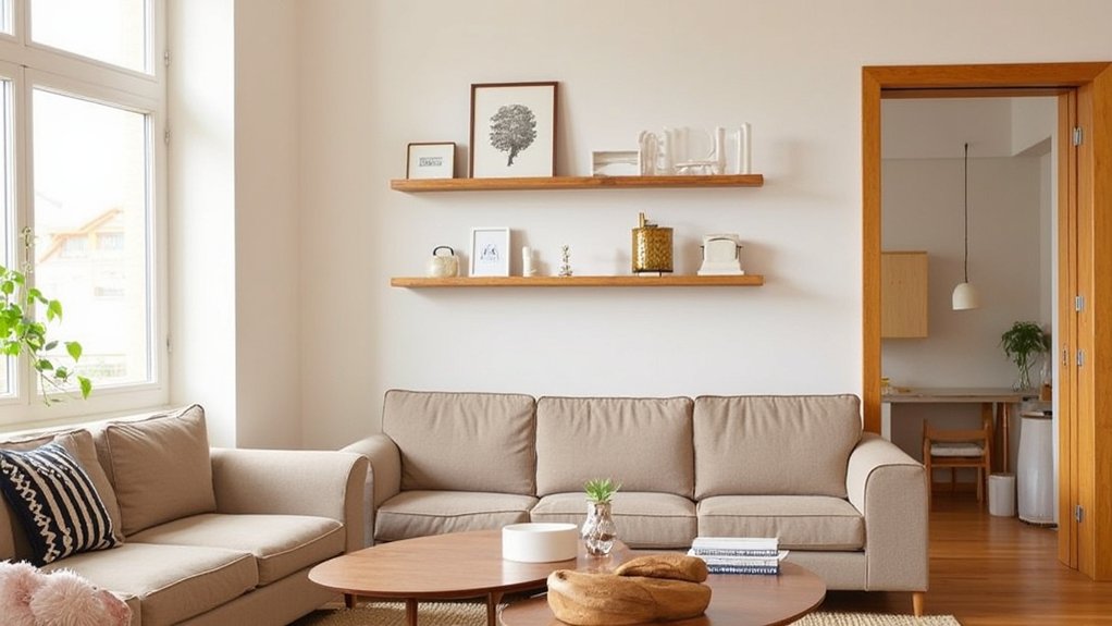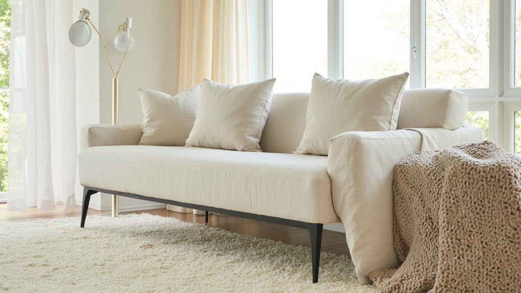 Plunge into the world of soft neutral textiles to instantly cozy up your modern living room. You’ll love how creams, beiges, and soft grays transform your space with warmth. Drape a 50×60-inch cotton throw over your sofa for texture, and swap heavy curtains for sheer 84-inch panels in oatmeal tones.