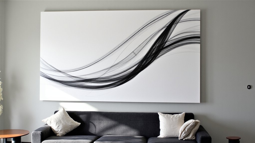 When you’re ready to elevate your modern living room, consider minimalist wall art to keep the space uncluttered yet stylish. These simple pieces add charm without overwhelming your cozy vibe. Hang artwork within 2-3 weeks of redesigning to finalize the look, ensuring it’s at eye level, about 57-60 inches from the floor.