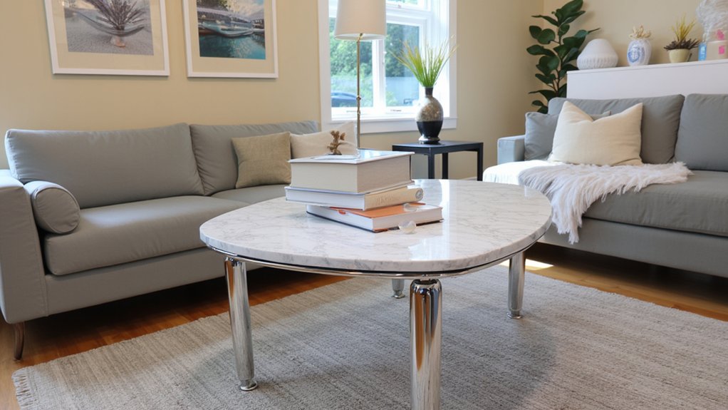 If you’re aiming to elevate your modern living room, consider adding a sleek marble coffee table as your centerpiece. It’s a perfect blend of cozy and chic, instantly upgrading your space with its polished look. Opt for a table around 40-48 inches long to fit most sofas, ensuring balance.