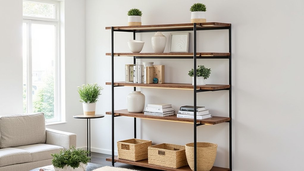 Moving from the soft comfort of plush velvet pillows, let’s explore the sleek appeal of chic metal shelving to elevate your living room. These units add a modern edge and keep clutter at bay with style. Opt for a 72-inch tall, black-framed shelf for a bold look.