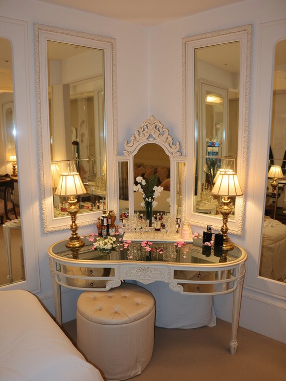 A mirrored vanity corner elevates a bedroom’s functionality by creating a dedicated space for personal grooming and daily preparation. The thoughtful combination of mirrors, proper lighting, and organized storage transforms an ordinary corner into an elegant getting-ready station.