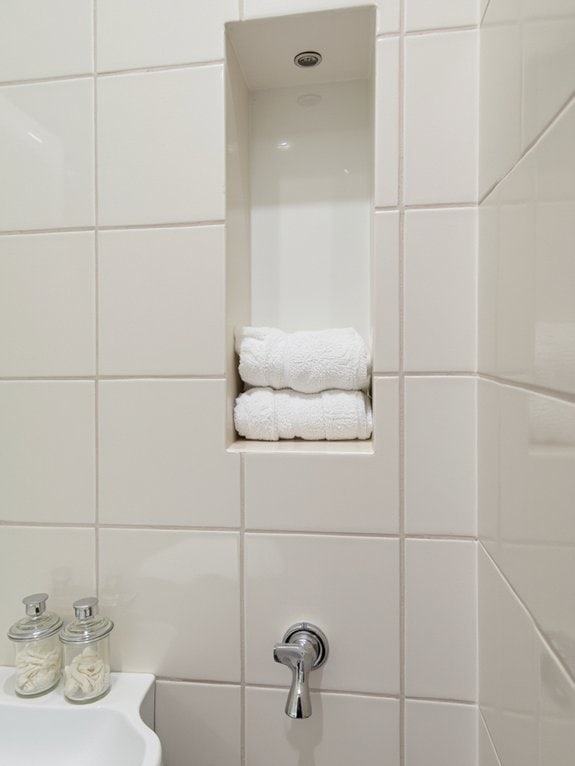 The niche installation requires basic tools and can be completed in about two hours by cutting into drywall between studs and adding proper framing. This space-saving feature transforms previously unused wall cavities into functional storage areas without taking up valuable floor space or requiring additional fixtures.