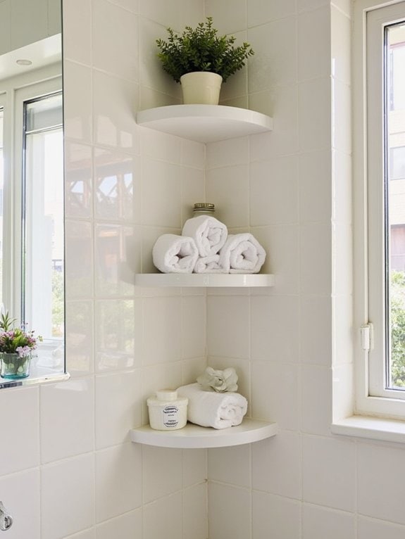 A corner shelf unit provides a practical storage solution for maximizing unused bathroom space. By utilizing empty corners, these shelves create additional room for toiletries, towels, and decorative items while maintaining a small footprint. The units typically extend 12-15 inches from the wall and can be installed in about 30 minutes using basic tools.