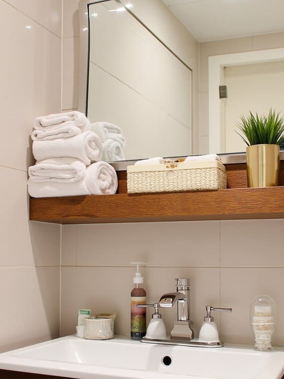 A floating vanity shelf provides a practical storage solution that maximizes bathroom space while maintaining a modern aesthetic. Installing this wall-mounted shelf eliminates floor clutter and creates an illusion of openness, particularly beneficial in compact bathrooms. Most models accommodate standard sink widths of around 30 inches.