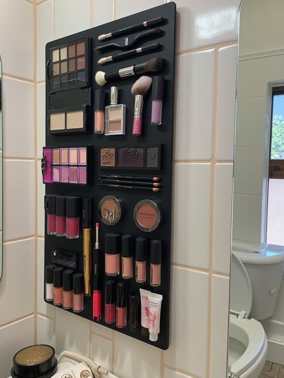 A magnetic makeup board transforms bathroom counters from cluttered spaces into organized zones. By mounting a magnetic surface on the wall, cosmetics and tools with metal components attach securely, keeping them visible yet off the counter. The board can be customized with paint or decorative elements to complement any bathroom décor.