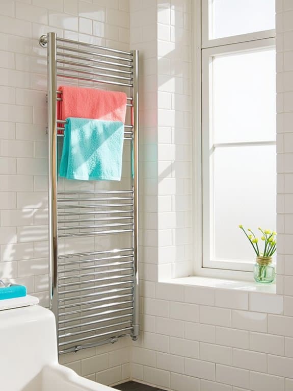 A vertical towel rack offers an efficient storage solution for bathrooms by utilizing wall space rather than valuable floor area. This space-saving installation transforms empty vertical surfaces into functional storage, perfect for hanging multiple towels while keeping them easily accessible.