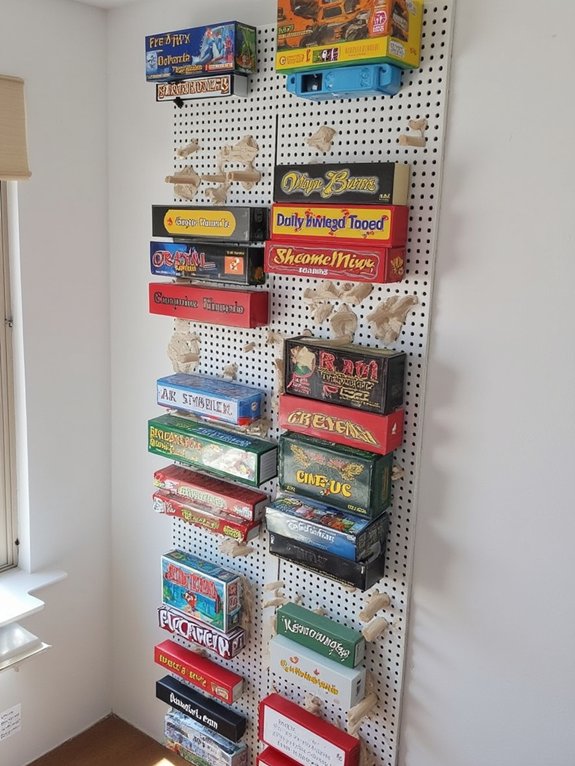 The pegboard display system offers a customizable wall storage solution for board games that combines practicality with visual appeal. By utilizing vertical space, games of different sizes remain easily accessible while creating an attractive display arrangement.