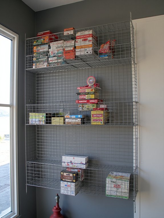 A mesh wall rack provides an efficient storage solution by utilizing vertical wall space to display and organize board games. The open mesh design allows easy viewing of game titles while securely supporting boxes of various sizes, transforming your collection into an attractive wall feature.