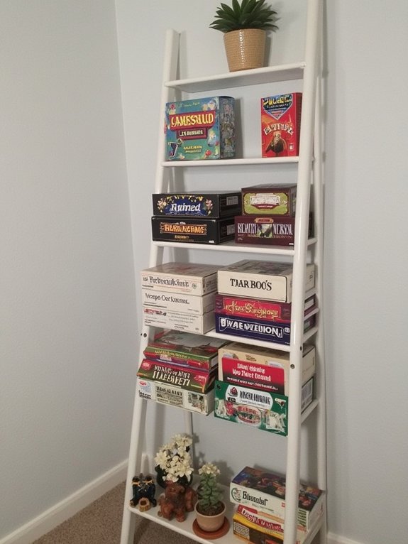 Ladder shelves offer an elegant way to store and display board game collections while making efficient use of vertical space. The angled design creates visual interest while keeping games organized and easily accessible in any room.
