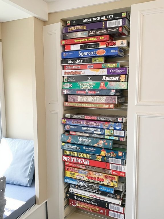 A hanging closet organizer offers an efficient storage solution for board games by utilizing vertical closet space. This accessible system allows games to be neatly arranged and easily retrieved while maximizing storage capacity.
