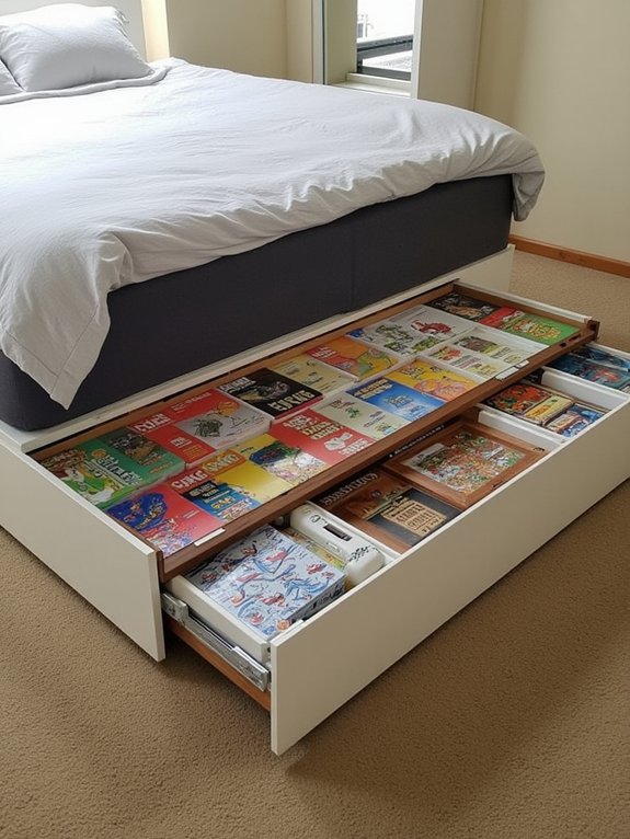 The key is selecting containers under 6 inches tall that fit your bed frame’s clearance. Install drawer slides on wooden platforms for smooth operation, and add internal dividers to keep games organized. Label each drawer’s front edge so you can quickly find specific games without having to pull everything out.