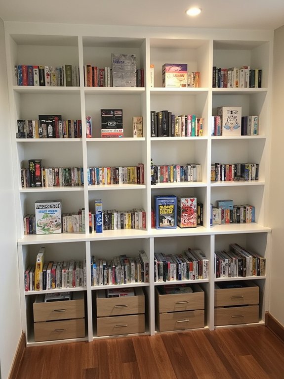 A bookcase room divider system serves the dual purpose of partitioning space while providing attractive storage for board games. This versatile solution allows you to create distinct areas within a room while keeping your game collection organized and accessible.