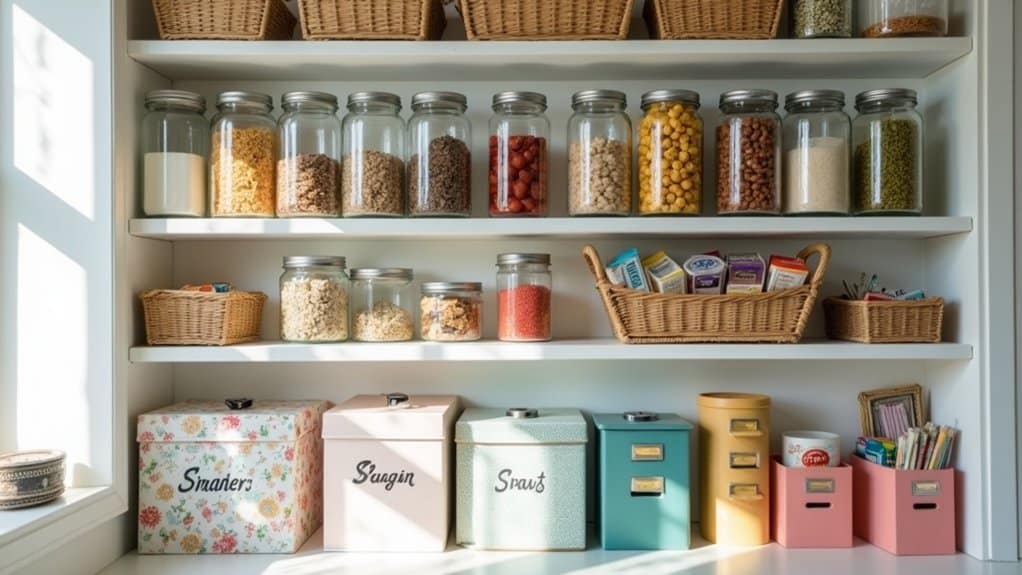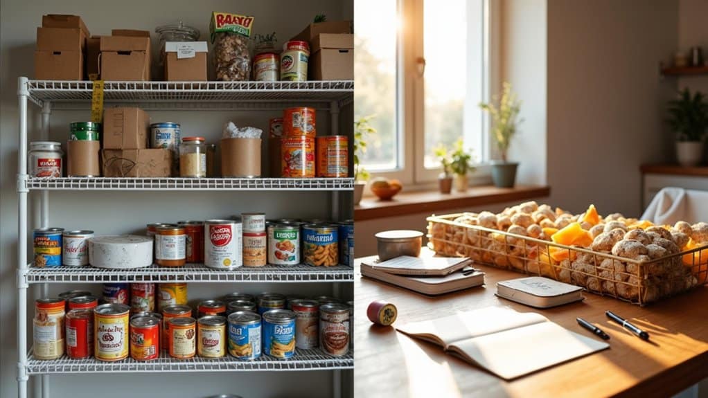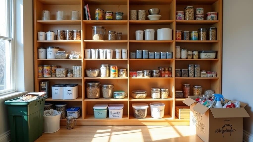 Next, categorize the items you removed to determine your storage needs. Group similar items together, like canned goods, baking supplies, or snacks, to see how much space each category requires. Check expiration dates and discard anything outdated or unusable to avoid cluttering the space with unnecessary items. Consider your household’s habits—do you buy in bulk, or do you need easy access to daily essentials? This step guarantees your pantry layout will be tailored to your lifestyle, making it both functional and efficient.