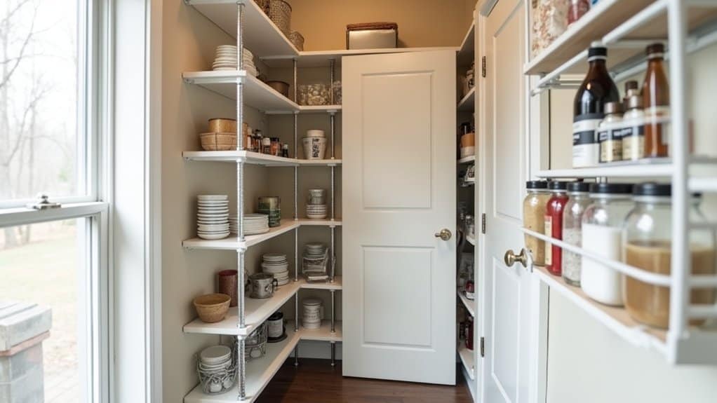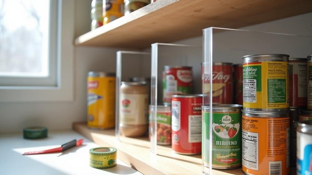 Crafting custom shelf dividers is a practical and affordable way to maximize space and maintain order in your pantry. Start by measuring the dimensions of your pantry shelves, noting the height, depth, and width to guarantee your dividers fit perfectly. Gather materials such as sturdy cardboard, foam board, or thin plywood, along with a ruler, pencil, and cutting tools like a utility knife or saw. Cut the material to match the height and depth of your shelf, creating vertical dividers that can separate items like canned goods, boxes, or jars.