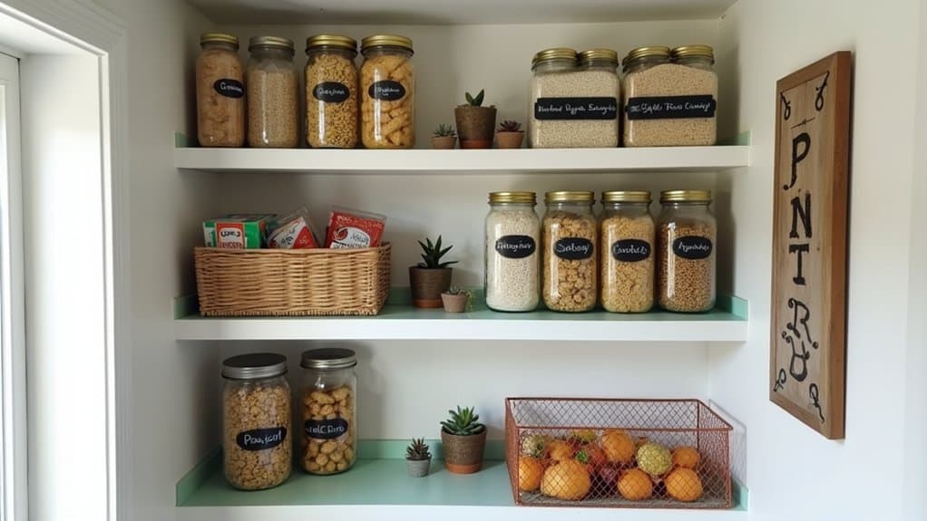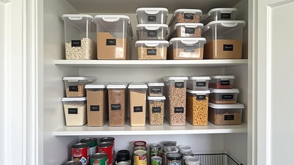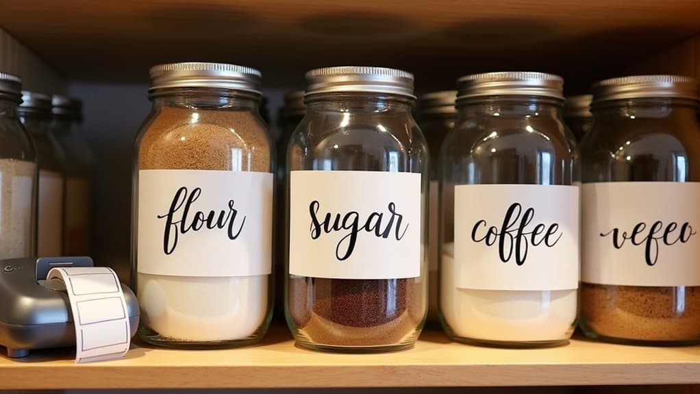 Labeling is a game-changer when it comes to pantry organization, as it guarantees you can quickly find what you need without rummaging through shelves. Start by choosing clear, easy-to-read labels, whether you opt for pre-made adhesive stickers, a label maker, or handwritten tags for a personal touch. Apply labels to containers, jars, or bins, making sure to include the item name and, if helpful, the expiration date or date of purchase. This simple step not only saves time but also prevents food waste by keeping track of freshness.