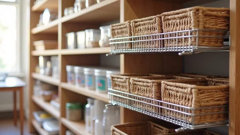 Pull-out baskets are a game-changer for pantry organization, offering easy access to items tucked away in deep cabinets or shelves. Start by measuring the dimensions of your pantry shelves or cabinets to guarantee the baskets you choose fit perfectly without wasting space. Opt for sturdy, wire-framed baskets or plastic bins with handles, as these materials are durable and allow visibility of contents at a glance. Install the pull-out mechanisms according to the manufacturer’s instructions, confirming they are securely mounted to withstand the weight of canned goods, snacks, or other pantry staples.