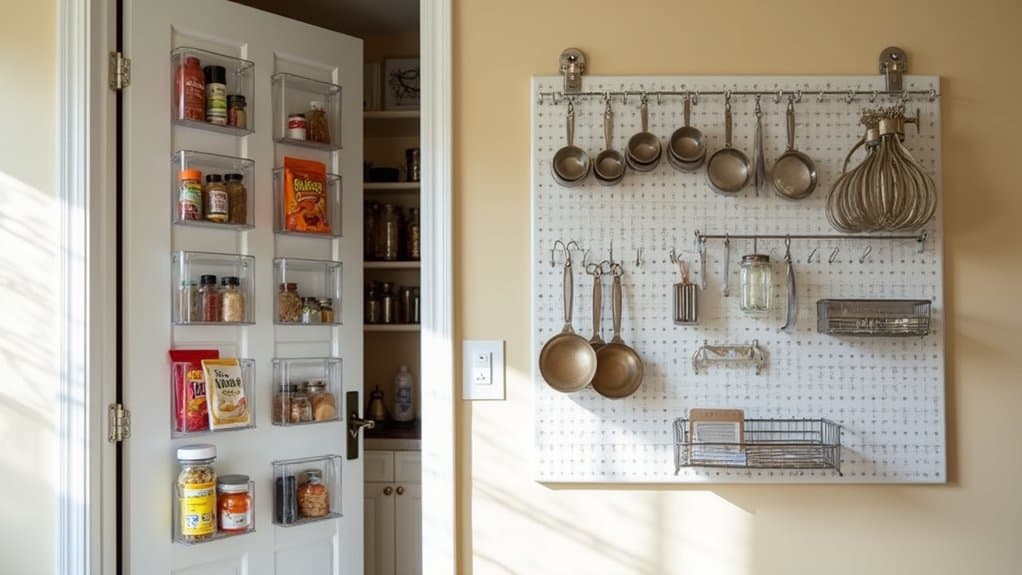 For wall space, mount shelves or pegboards to store bulkier items like canned goods, jars, or kitchen tools that don’t fit in cabinets. Pegboards are especially versatile, as you can rearrange hooks and baskets to accommodate changing storage needs over time. Wall-mounted wire racks or narrow shelves can also hold frequently used items, keeping them within easy reach while freeing up floor and cabinet space. Make certain to measure your wall area carefully and secure heavy-duty brackets or anchors to guarantee safety and durability.