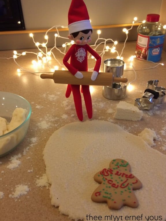 Create a magical morning surprise by setting up your Elf on the Shelf in a cookie-baking scene. Position the elf near a mixing bowl surrounded by tiny cookie cutters, sprinkles, and miniature baking tools.