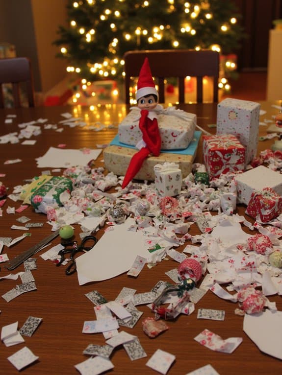 The setup includes a tiny table with 2-inch squares of wrapping paper, small ribbon pieces, and child-safe scissors. Position your elf with partially wrapped presents to demonstrate proper techniques, and add a handwritten note with wrapping tips to inspire young helpers during the holiday season.