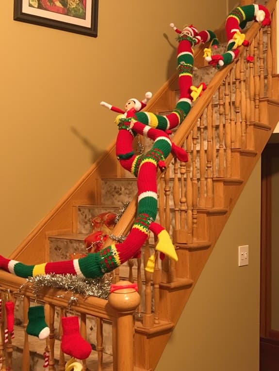Create a delightful hallway sock slide for your elf by laying out a line of colorful socks across the floor. Position your elf at one end wearing tiny socks, ready to slide down this whimsical runway. Set up 6-8 pairs of socks in a straight path about 4 feet long.