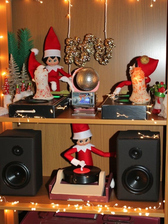 Complete the party scene by adding tiny paper music notes, miniature speakers, and other toys as dancing companions. Position some holiday music nearby to suggest your elf has been hosting an enthusiastic dance party while the household slept, making the setup both magical and mischievous.