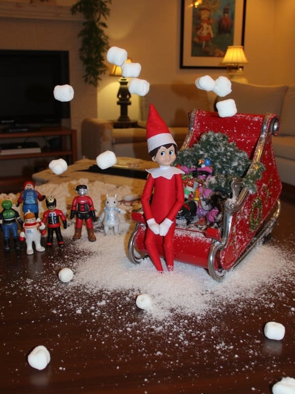 Transform an ordinary indoor space into a whimsical winter scene for an elf’s snowball fight using mini marshmallows, cotton balls, and creative positioning. A tissue box becomes a snowy fort, while scattered marshmallows serve as ammunition for the playful battle.