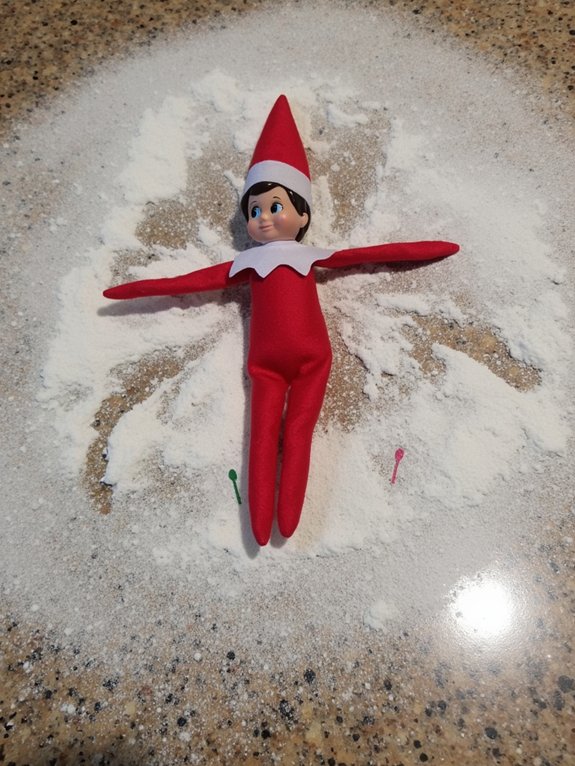 Create charming indoor snow angels using your Elf on the Shelf and common kitchen ingredients like powdered sugar or flour. By spreading a thin layer of the white powder on a dark surface, you can position your Elf and make miniature snow angel impressions that capture the magic of winter play.