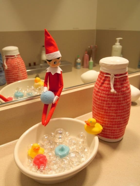 Position your elf in the cotton-filled bath, creating a cozy spa atmosphere that captures the playful spirit of the holiday season. This simple setup transforms an ordinary space into an enchanting elf retreat that delights both children and adults.