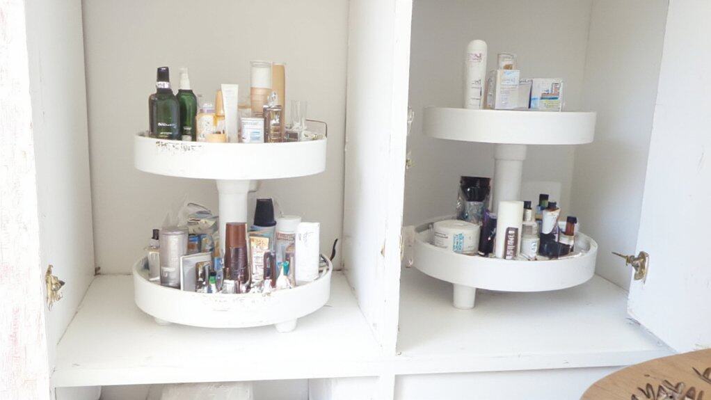 To use Lazy Susans effectively, group similar items together on each tray, such as hair products or skincare essentials, for quick identification. Make sure the trays are not overloaded to prevent tipping and maintain easy rotation. Label the edges of the trays if needed to quickly spot categories, making your bathroom closet both functional and clutter-free.