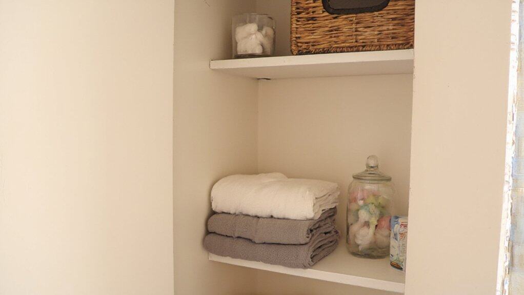 Once the shelves are securely mounted, arrange items strategically to optimize accessibility and organization. Place frequently used items like towels or toiletries on the most accessible shelves, while storing less-used items higher up or in labeled bins. This setup not only enhances the functionality of your bathroom closet but also keeps it clutter-free and visually appealing.