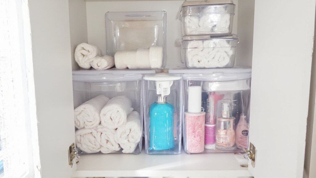 Using clear storage bins is an effective way to organize a bathroom closet, as they allow you to see contents at a glance without needing to rummage through items. Choose bins of varying sizes to accommodate different products like toiletries, cleaning supplies, or towels, and opt for stackable options to maximize vertical space. Ascertain the bins are made of durable, moisture-resistant material since bathroom environments can be humid.