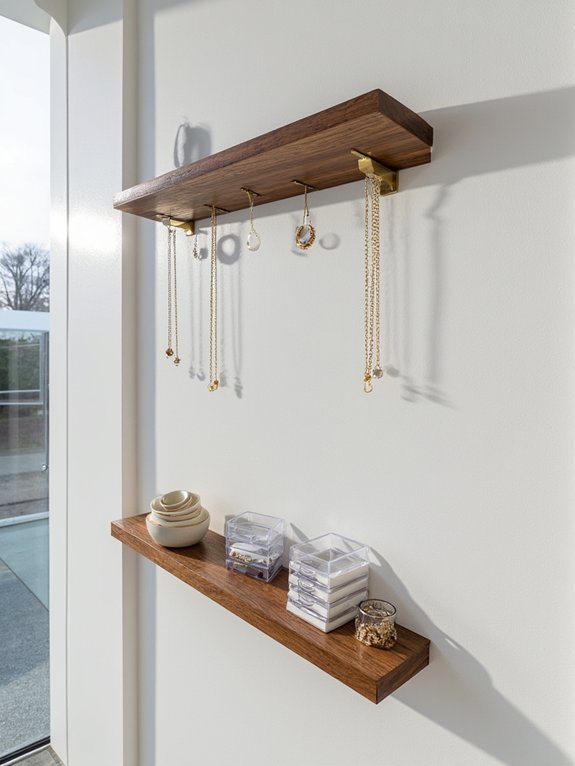 A floating shelf display system offers an elegant solution for showcasing jewelry pieces while keeping them organized and accessible. The system uses 24-inch floating decor shelves mounted 12 inches apart vertically on the wall, with decorative hooks for necklaces and small dishes for rings and earrings.