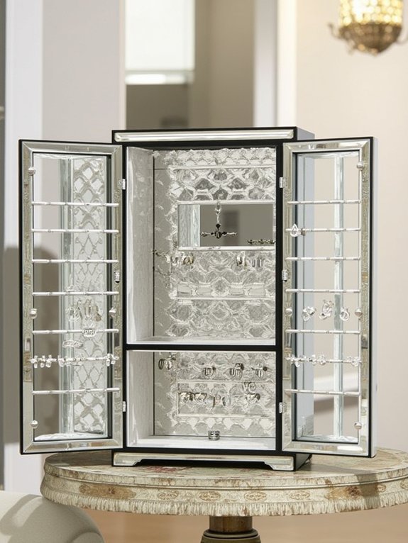The stand features mirror panels on three sides, velvet-lined compartments, and a protective lid to prevent dust. Its rotating base provides easy access, while adjustable dividers accommodate different jewelry sizes. When positioned near natural light but away from direct sun exposure, the mirrors enhance visibility while protecting valuable pieces.