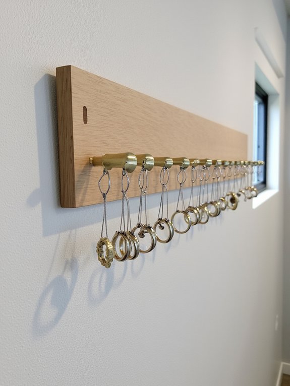 A wall-mounted ring bar display transforms jewelry storage into an elegant wall feature. By installing horizontal bars directly onto the wall at eye level, rings become both organized and artfully displayed, creating a practical yet decorative solution for jewelry collectors.