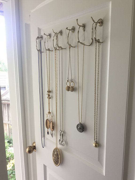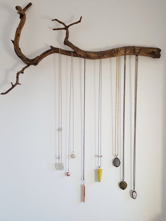 A hanging branch offers a rustic, natural approach to displaying necklaces while adding organic beauty to any room. By mounting a cleaned, sturdy branch with multiple offshoots, you create an artistic jewelry organizer that serves both form and function.