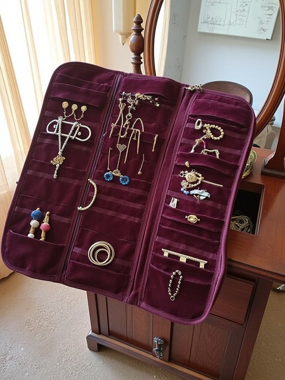 The organizer rolls up to fit easily in carry-on bags or purses, then unrolls flat for convenient access. Clear pockets allow quick identification of specific pieces without having to unpack everything, making it an efficient way to keep jewelry organized and protected during trips.