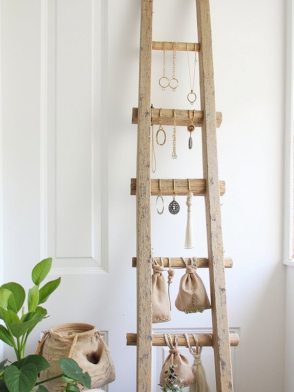 An old wooden ladder can be transformed into an elegant storage display for jewelry and accessories. By sanding, staining, or painting the ladder and installing hooks and small dishes along its rungs, you create a functional vertical organizer with rustic appeal.
