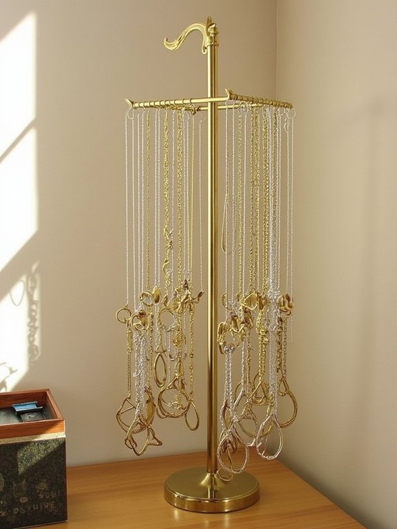 A standing necklace storage tower provides vertical organization for multiple necklaces while preventing tangles and knots. The tower features hooks or pegs mounted at different heights on a central pole, allowing necklaces to hang freely and remain easily accessible.