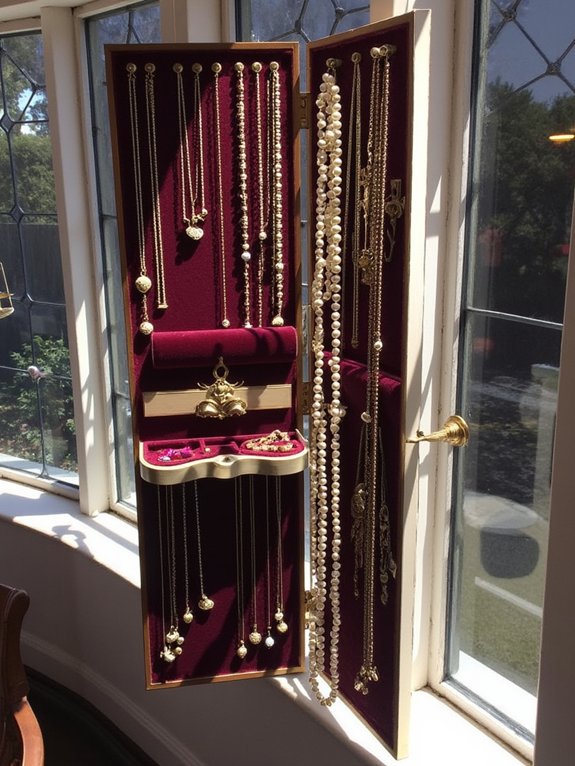 A repurposed window frame transformed into a jewelry display combines vintage charm with practical organization. By removing the glass and lining the frame with rich velvet fabric, you create an elegant backdrop for showcasing jewelry pieces while keeping them easily accessible.