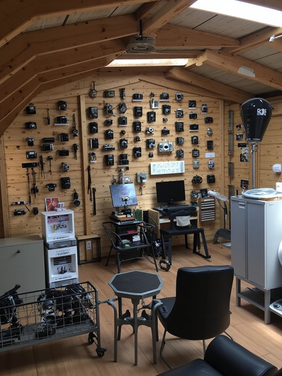 The photography studio cave is a specialized workspace designed to house essential photography equipment and create optimal shooting conditions. With dedicated storage for cameras, lenses, and accessories, along with professional lighting setups and backdrop options, it serves as a comprehensive environment for photographers.
